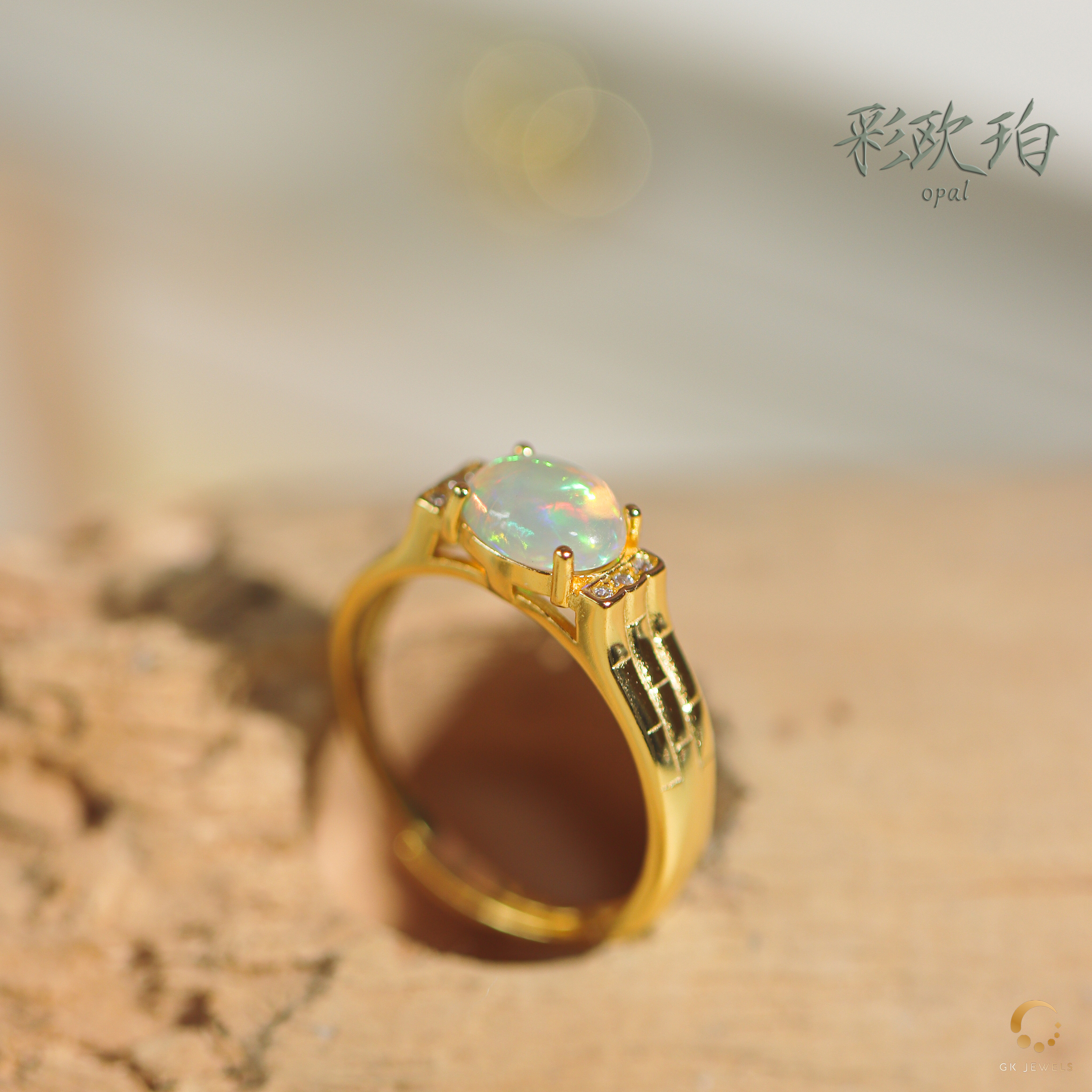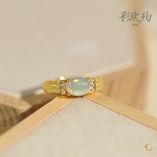 彩欧珀蛋形带钻戒指 6x8mm左右
