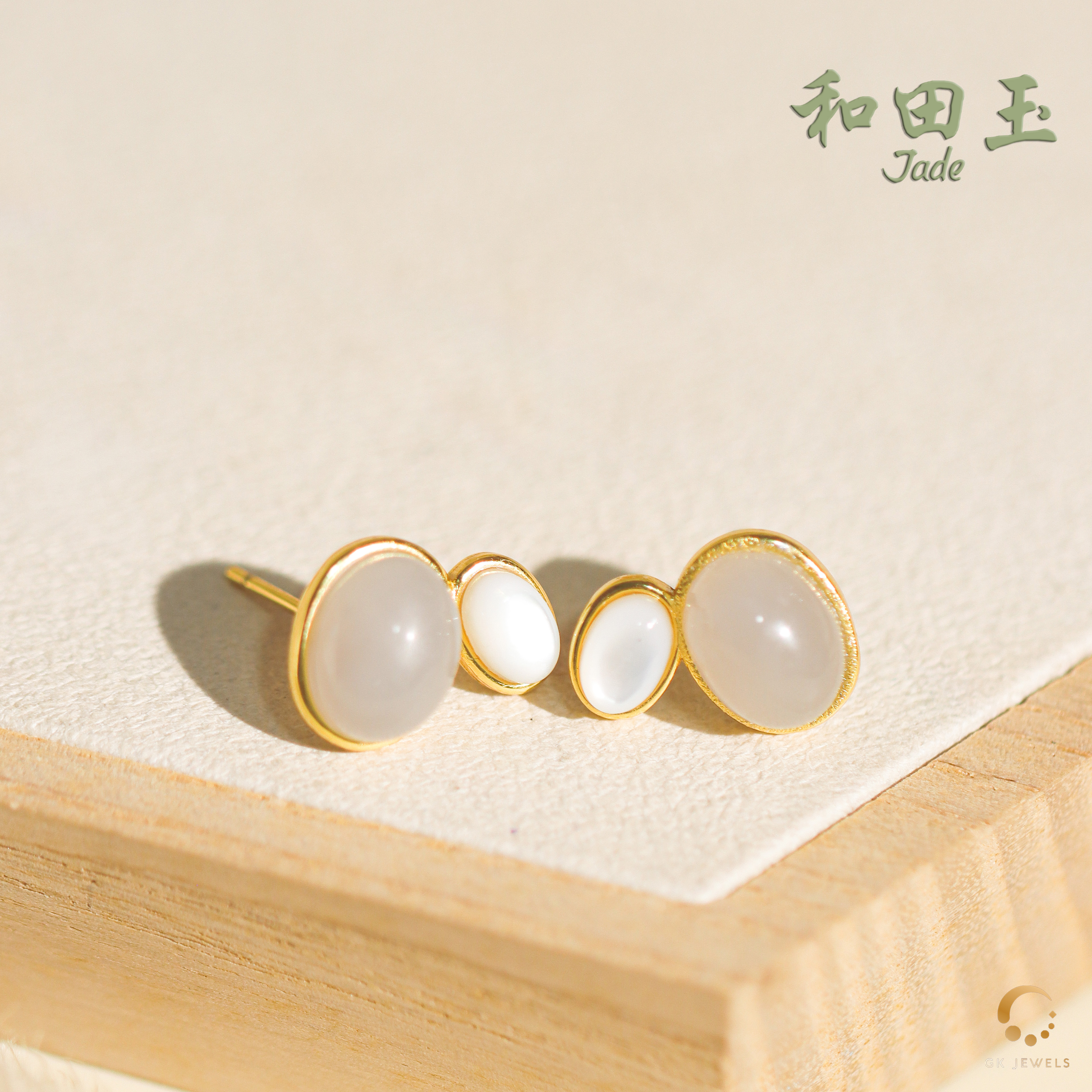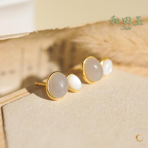 烟紫和田玉蛋形配白贝蛋形耳钉 7x9mm左右