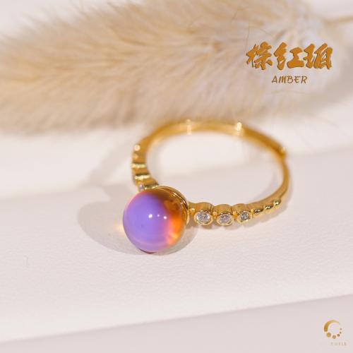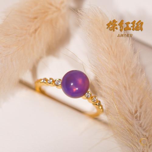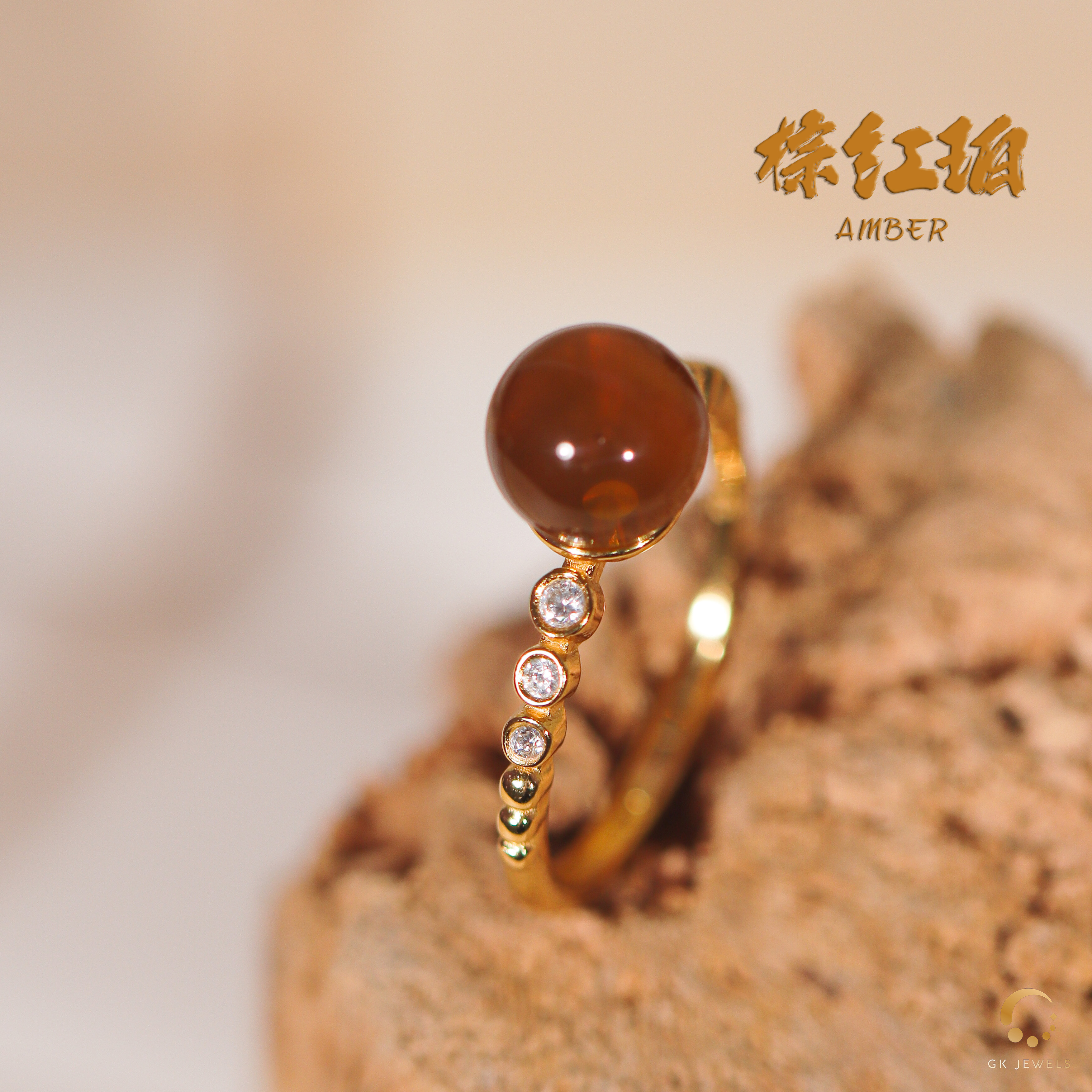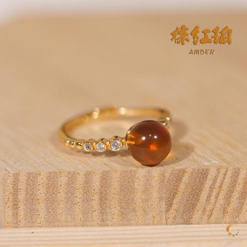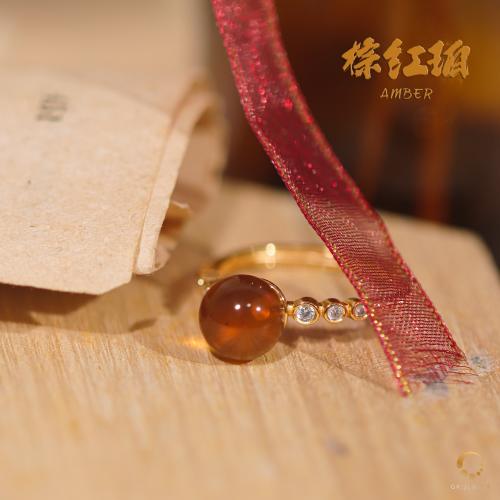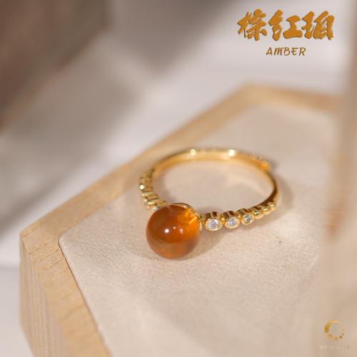 棕红珀带钻戒指 7mm左右