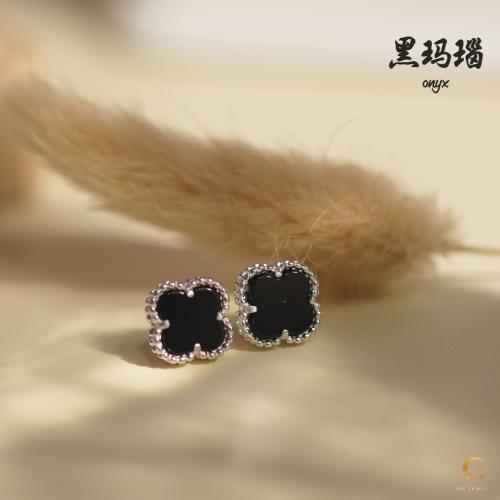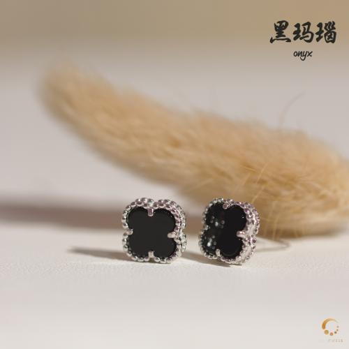 黑玛瑙四叶草耳钉(银色)9mm左右